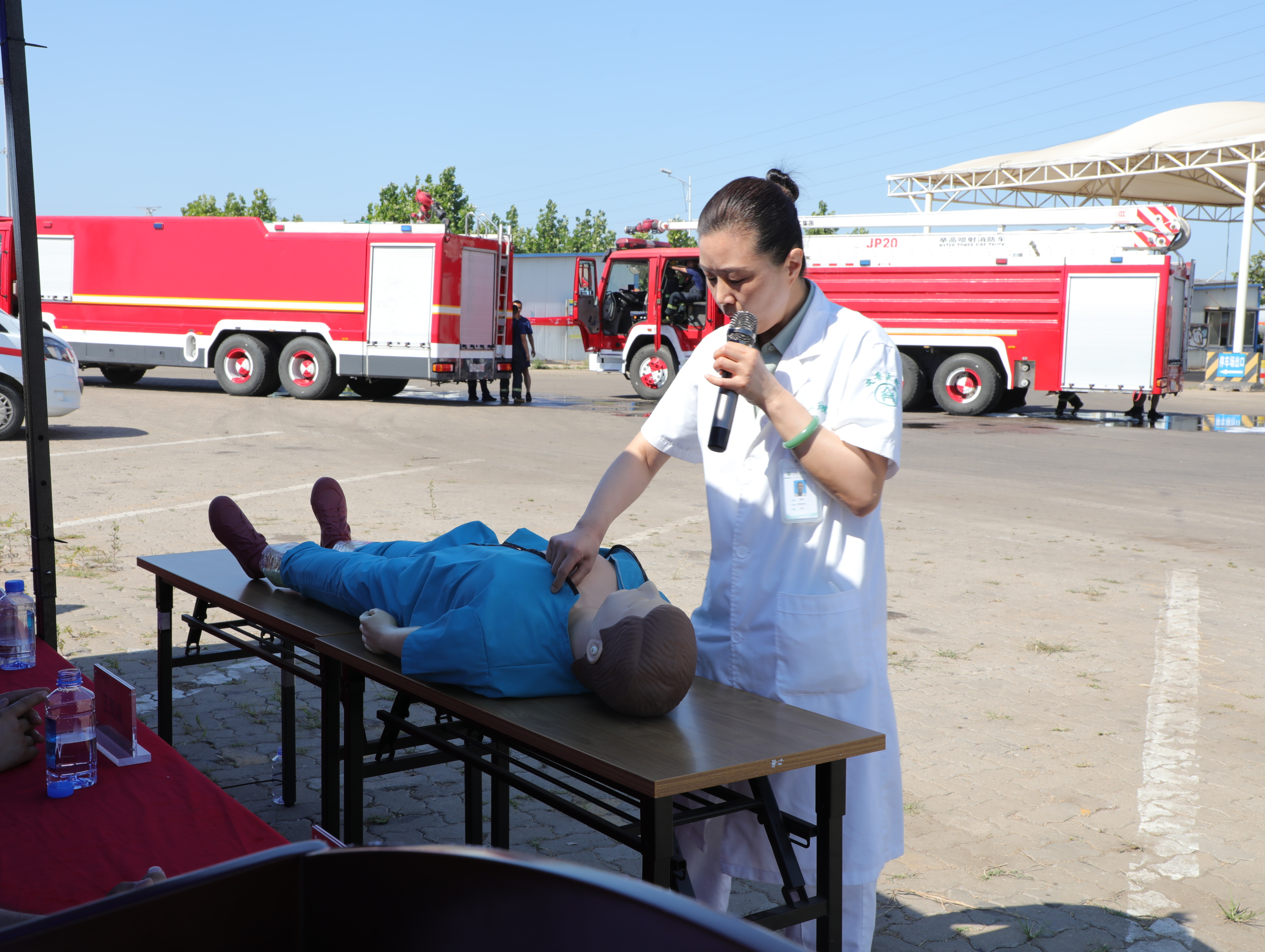 此次演练模拟了公司LNG运输车辆在执行运输计划途中被后方车辆追尾造成运输的LNG泄漏事故,驾押人员采取现场应急处置措施,公司主要负责人启动生产安全事故应急预案,各应急救援小组开展现场应急处置。最终在龙口市电厂路消防救援中队和裕龙急救急诊中心的全力协助下,抢险队伍高效、有序地完成泄漏点处置、伤员救治和舆情控制等工作。演练结束后,裕龙急救急诊中心的医生现场对全体参演人员开展创伤处置和心肺复苏的专题培训。