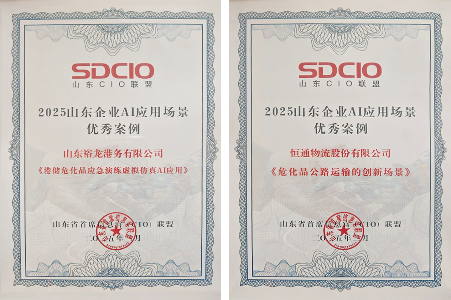 3月15日,在山东CIO联盟举办的2025山东企业数智化创新应用峰会中,恒通物流股份有限公司申报的“危化品公路运输的创新场景”、山东裕龙港务有限公司申报的“港储危化品应急演练虚拟仿真AI应用”荣获山东企业AI应用场景优秀案例奖。